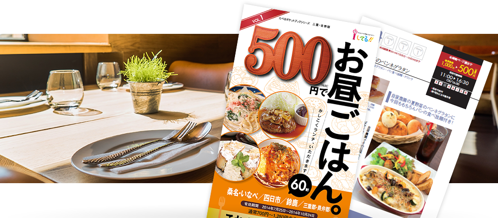 「500円でお昼ごはん。」は、当社が発行する中でも人気の高い、クーポン付ランチガイドブックです。 このガイドブックを持参いただくと、通常700円以上のランチメニューがワンコインで楽しめます。掲載されたお店からは、1日で平均20件以上の利用者があったとの報告も多数あり、新しいお店を続々と掲載しています。ぜひ、毎日のお昼ごはんを充実したものに ご活用ください。